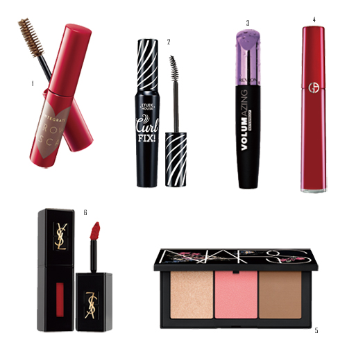 1.INTEGRATE 完美特調眉彩膏6g/NT240。2.ETUDE HOUSE 睫對出色~極限萌翹搶眼睫毛膏(防暈染)黑色8g/NT420。3.REVLON 不可思議豐盈睫毛膏951激黑/NT350。4.Giorgio Armani 奢華絲絨訂製唇萃#400/NT1,250。5.NARS 熱帶扶桑頰彩盤/NT1,850。6.YSL 奢華緞面漆光唇釉#422緋紅電音/NT1,280。