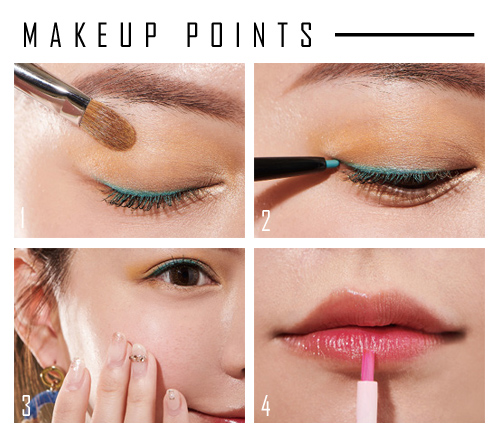 選擇彩色的眼彩筆,從眼頭往眼尾勾勒出眼線,增加眼妝亮點。