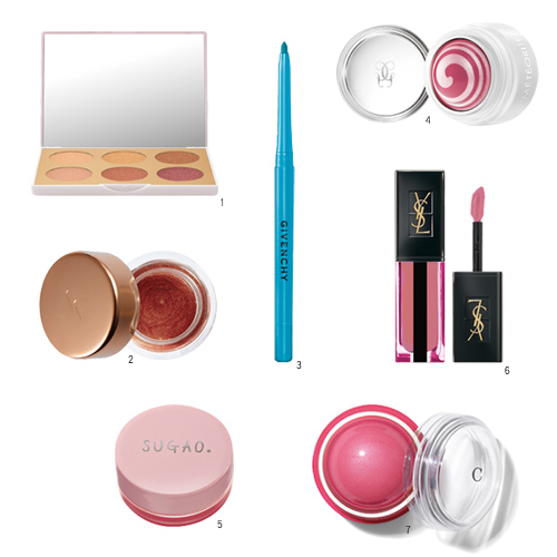 1.M.A.C 電光大理石系列時尚專業6色頰彩#Ignite Wonder 18g/NT1,750。2.PONY EFFECT 幻彩眼影霜#豔陽橙6g/NT690。3.紀梵希 防水訂製眼線筆#10蔚藍0.28g/NT750。4.Guerlain 幻彩腮紅霜 日夢遊限量版(甜心玫瑰色)4g/NT1,600。5.SUGAO 天生粉嫩舒芙蕾腮紅#桃粉 4.8g/NT380。6.YSL 奢華緞面水光染唇釉#614粉紅沉溺/NT1,280。7.香緹卡 2019季彩妝花妍水凝頰霜#Gladiola劍蘭/NT1,650。