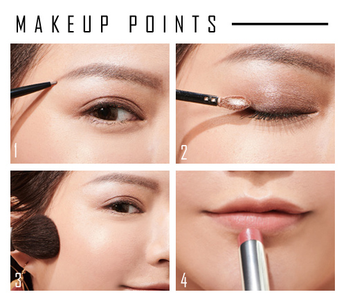 唇彩使用自然裸粉色調,均勻塗抹於雙唇,提升整張臉的氣色,又不會過於搶戲。