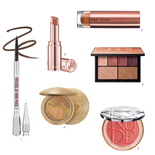 1.benefit 這細我的眉筆/NT990。2.Bobbi Brown 炫金高光液態眼影#火鑄銅Copperhead 4ml/NT900。3.NARS 沙漠玫瑰眼頰盤/NT2,300。4.Guerlain 提洛可仿曬粉餅夏日夢遊限量版22g/NT2,850。5.迪奧 輕透光燦妍彩盤#01 6g/NT2,000。6.蘭蔻 絕對閃耀水蜜光唇膏#232/NT1,100。