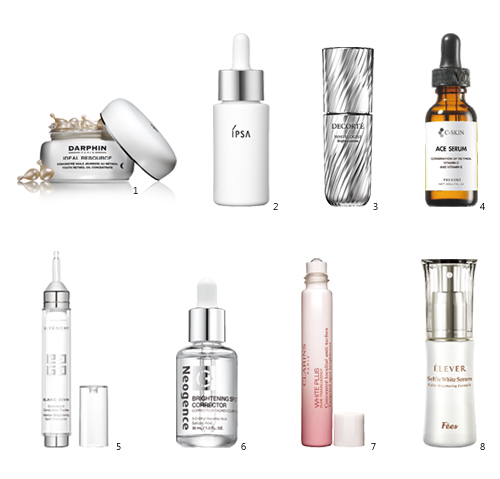 1.DARPHIN 維他命A精露膠囊60顆/NT4,250。2.IPSA 肌淨白精萃OP 20ml/NT2,000。3.黛珂 瑩潤粹白晶鑽超導精華40ml/NT4,350。4.杜克C 複方強效精華液ACE 30ml/NT5,800。5.GIVENCHY 花漾鑽肌淨白淡斑精華筆15ml/NT2,850。6.Neogence 極透光亮白淡斑精華30ml/NT1,350。7.克蘭詩 智慧美白淡斑筆7ml/NT1,300。8.Fees 無限淨斑精華30ml/NT2,380用。