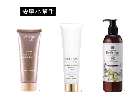 ▸ 1.W.SHOW植透肌超水感保濕身體乳230ml/NT1,280。2.Sisley抗皺活膚御緻美體精華150ml/NT9,900。3.香草集舒眠精油身體乳250ml/NT680。